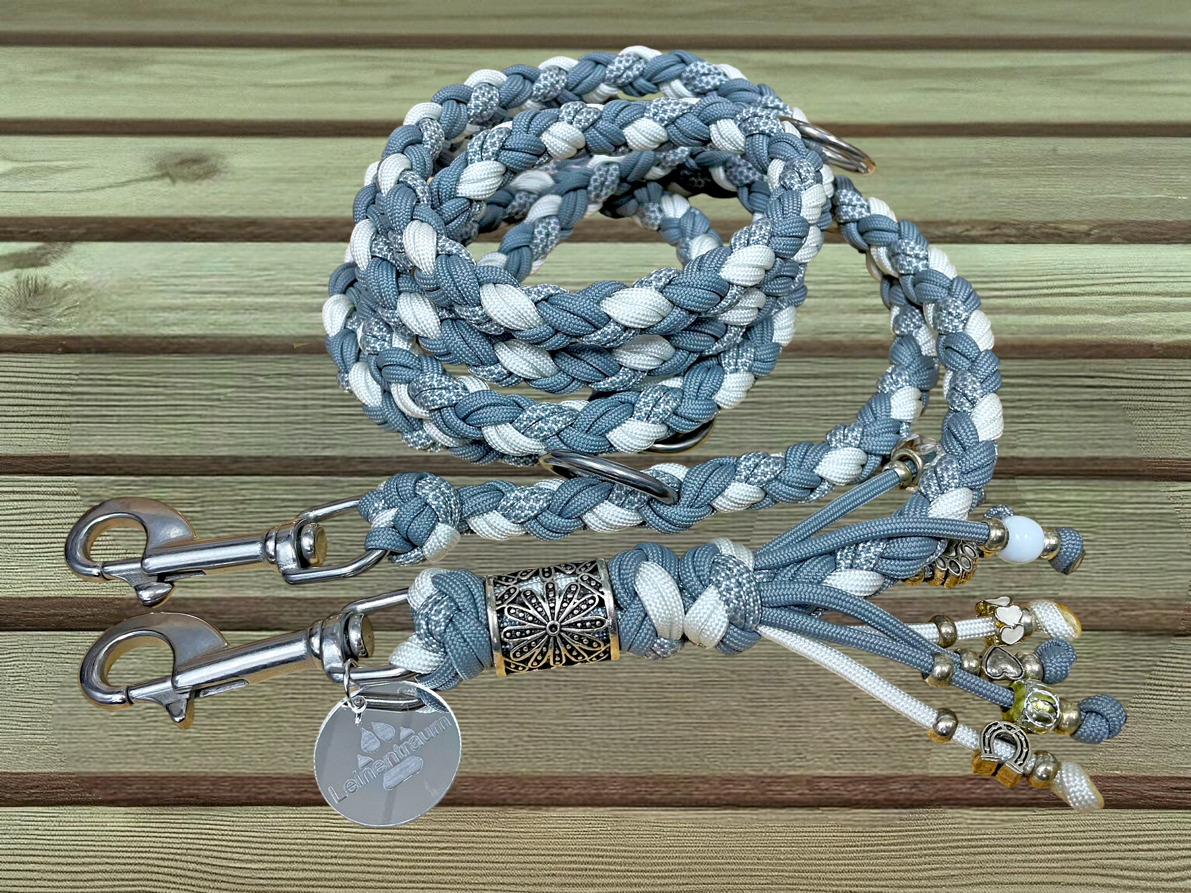 Das Paracord-Set Helmy – Silver Stone steht für zeitlose Eleganz und hochwertige Handarbeit. Die harmonische Farbkombination aus Weiß, Stonegrey und Stonegrey/Weiß Diamond wirkt modern, ruhig und stilvoll – perfekt für Hundehalter, die ein dezentes, edles Design bevorzugen.