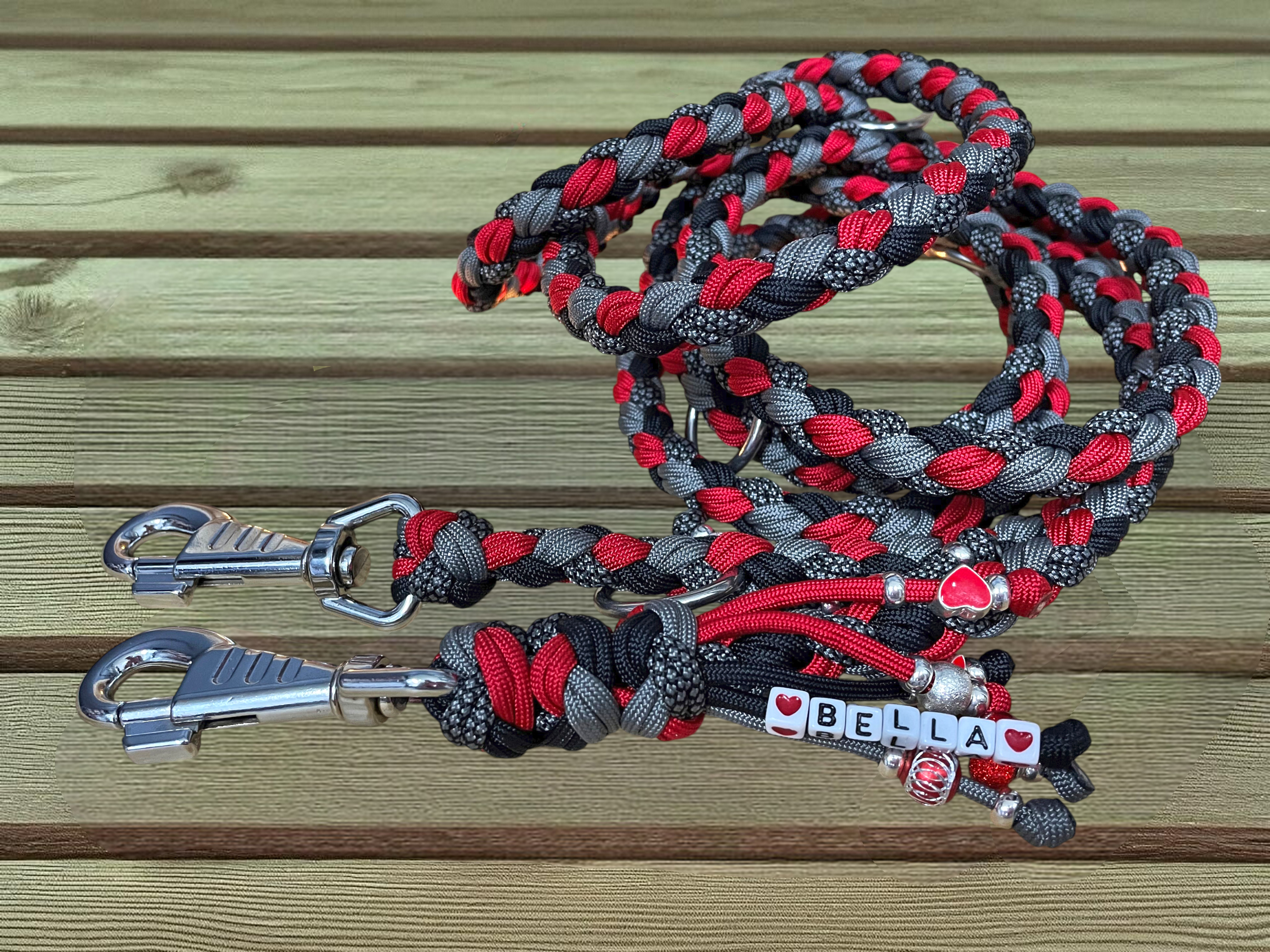 Die passende runde Hundeleine „Red Shadow“ ist ca. 2 m lang und 3-fach verstellbar, sodass sie flexibel an verschiedene Alltagssituationen angepasst werden kann. Auch hier kommen zuverlässige Edelstahlbeschläge zum Einsatz, die Funktionalität und Design perfekt ergänzen.
