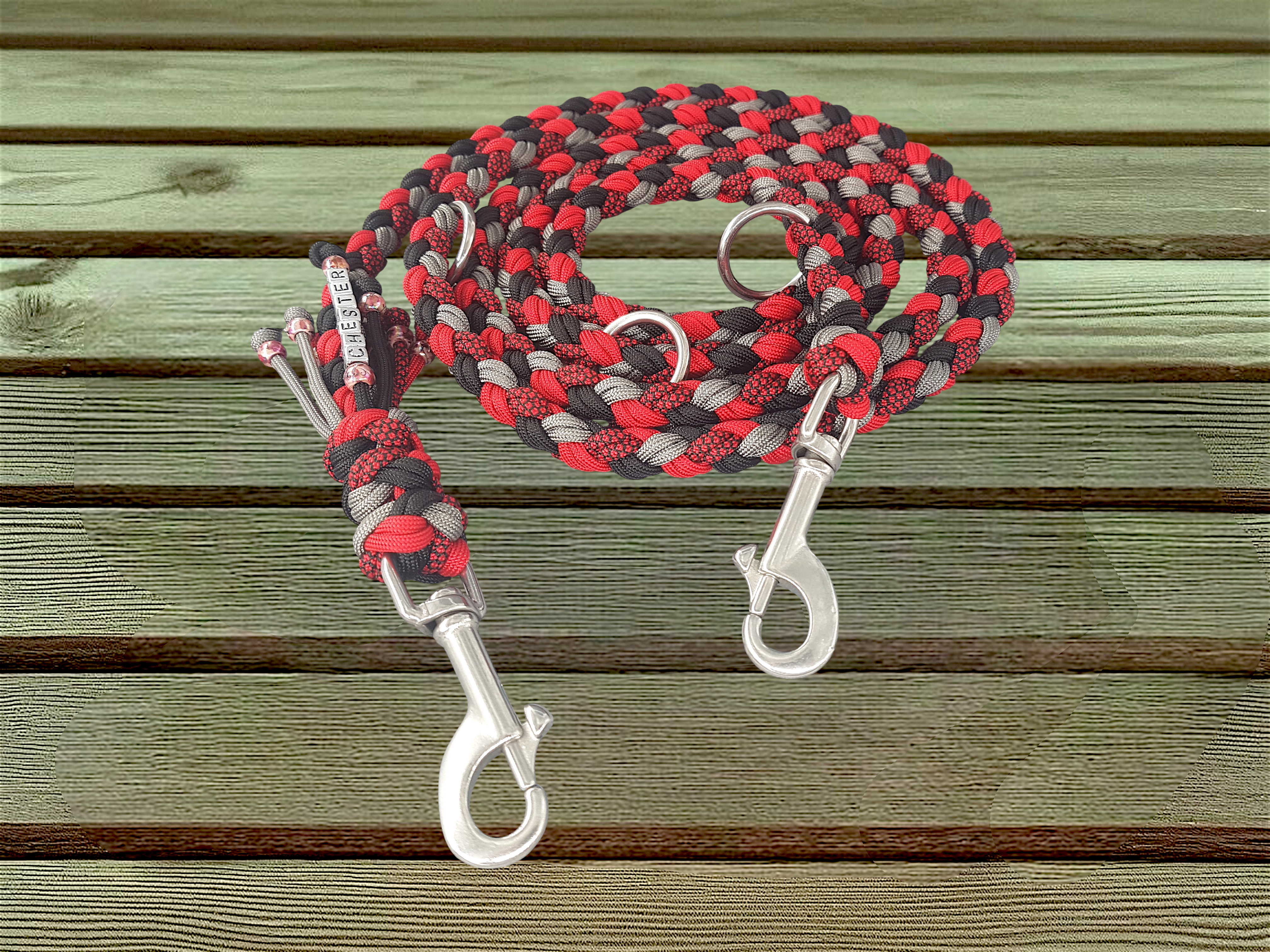Die markante Farbkombination aus Schwarz, Charcoal Grey und Imperial Red, ergänzt durch Imperial Red/Schwarz Diamond, verleiht der Leine eine dynamische, moderne Optik. Die runde Flechtung sorgt für ein gleichmäßiges Erscheinungsbild und liegt angenehm in der Hand. Die Edelstahlbeschläge sind robust, rostfrei und unterstreichen den hochwertigen Charakter der Leine.