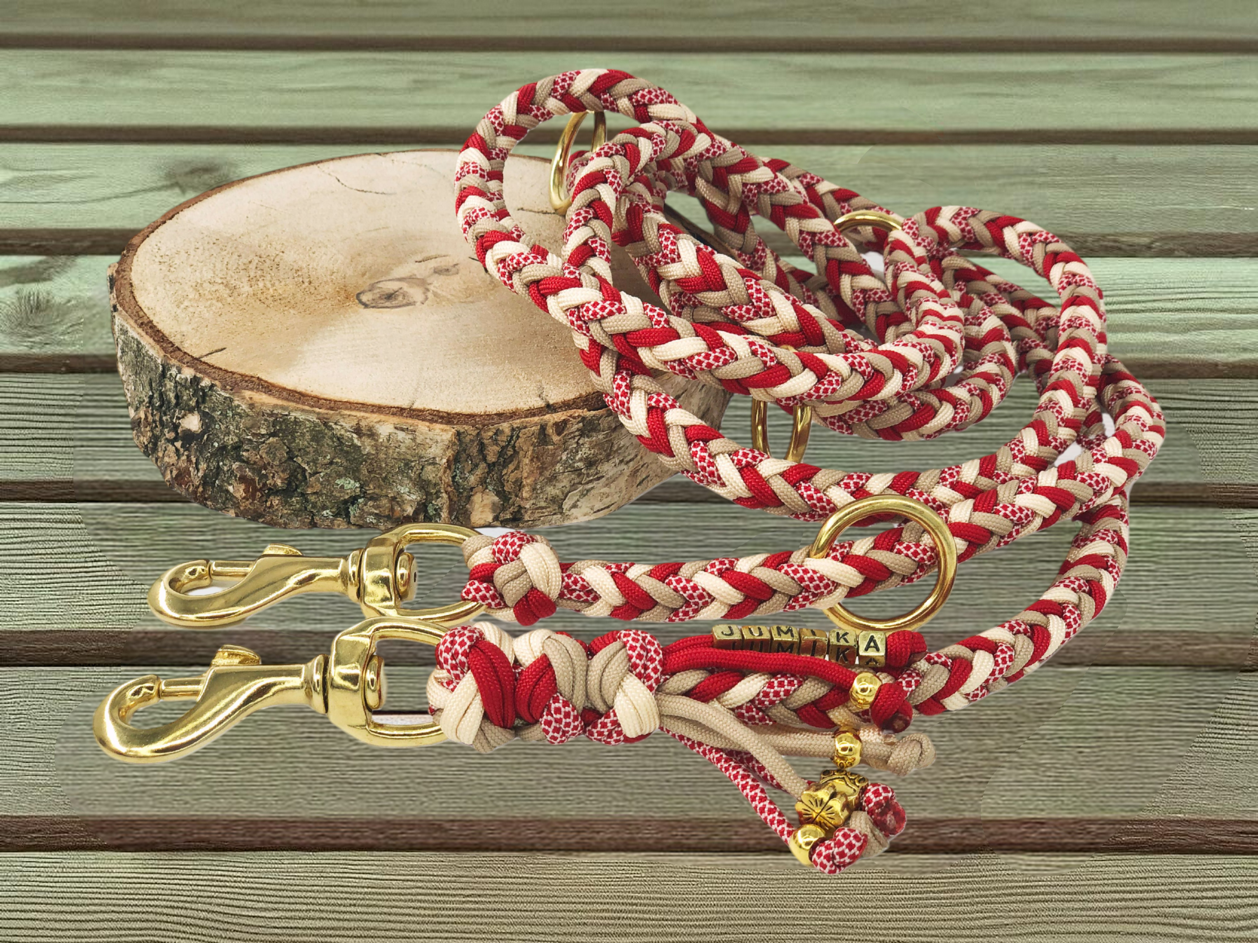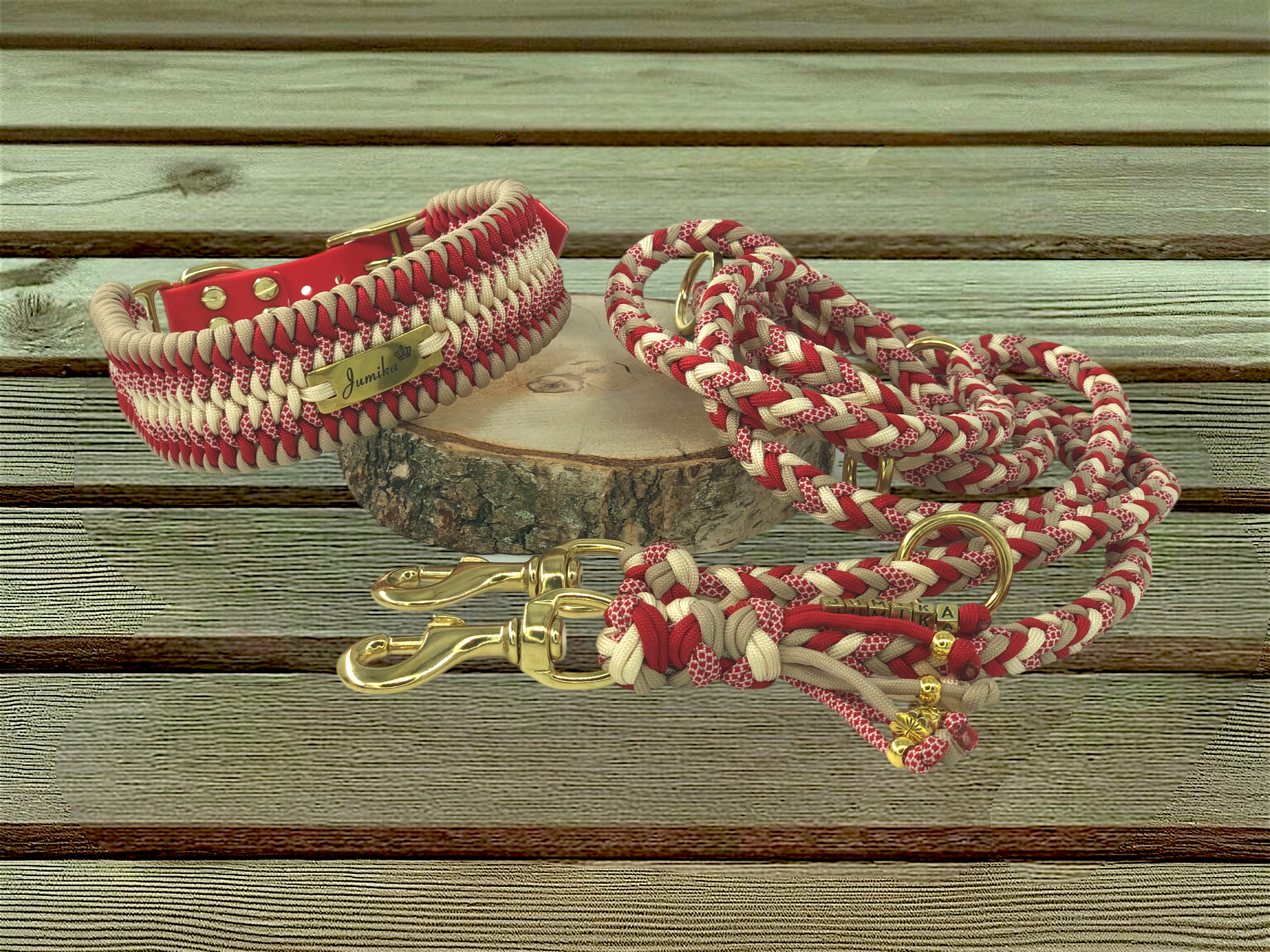 Die Farbkombination aus Creme, Tan 380 und Imperial Red / Creme Diamond sorgt für eine warme, klassische Optik. Ergänzt wird das Halsband durch einen roten Biothane-Adapter, der pflegeleicht, formstabil und alltagstauglich ist. Messingbeschläge an Halsband und Leine unterstreichen den hochwertigen Charakter des Sets und sorgen für zuverlässige Stabilität.