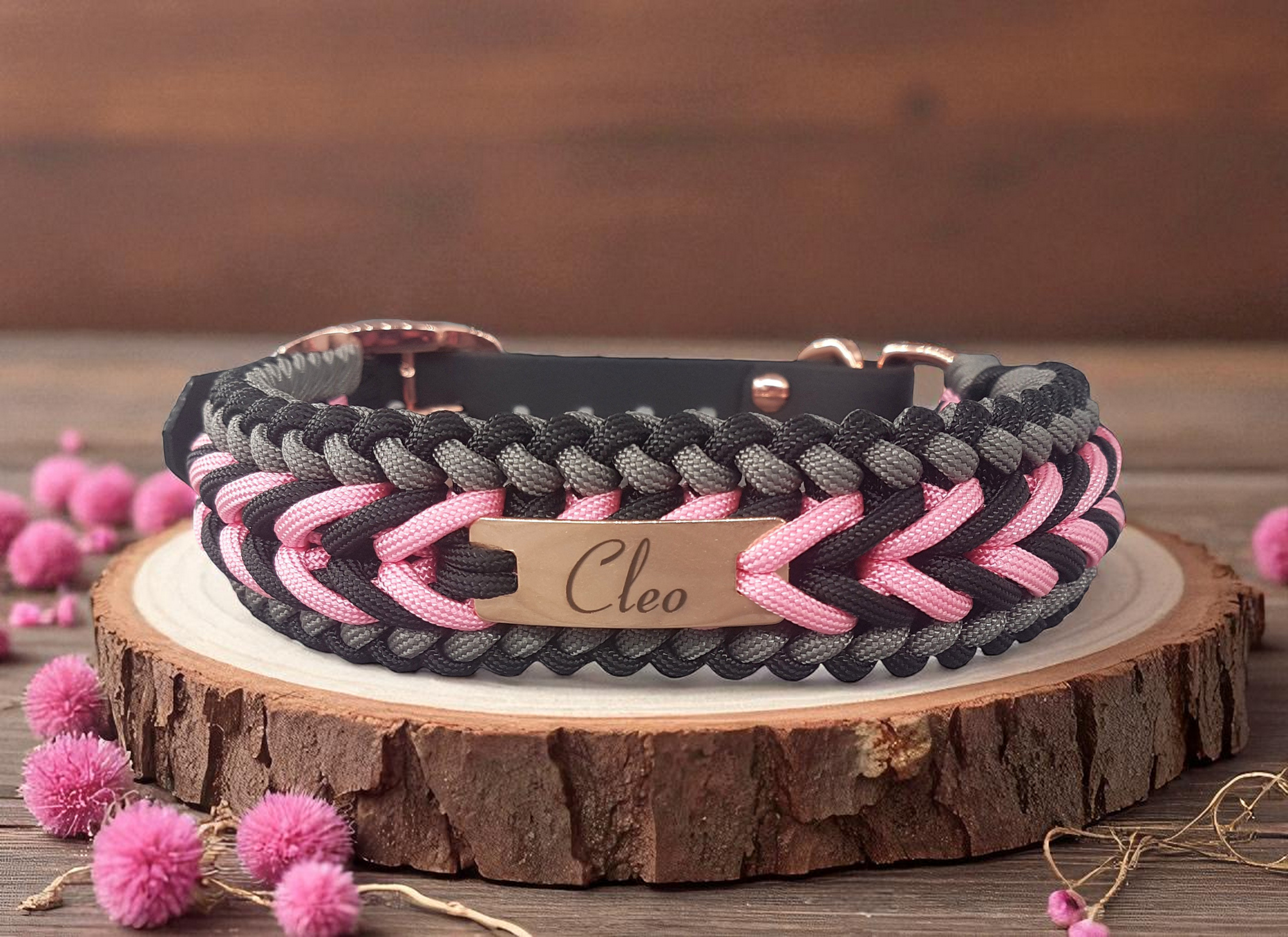 Das Halsband „Benno“ ist ca. 3,5 cm breit und ca. 1 cm dick. Der schwarze Biothane-Adapter ermöglicht eine flexible Anpassung an den Halsumfang Ihres Hundes und fügt sich dezent in das Design ein. Roségoldene Beschläge setzen edle Akzente und runden das Erscheinungsbild optisch stimmig ab.