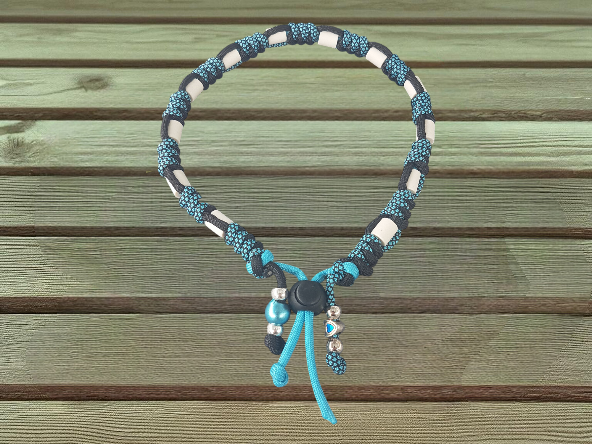 Diese handgefertigte EM Keramik Kette für Hunde wird im Snake Knoten aus hochwertigem Paracord gefertigt. Die elegante Farbkombination aus Schwarz und Türkis/Schwarz Diamond sorgt für einen modernen, zugleich zeitlosen Look. Eingearbeitete weiße EM Keramik Pipes runden das Design harmonisch ab.