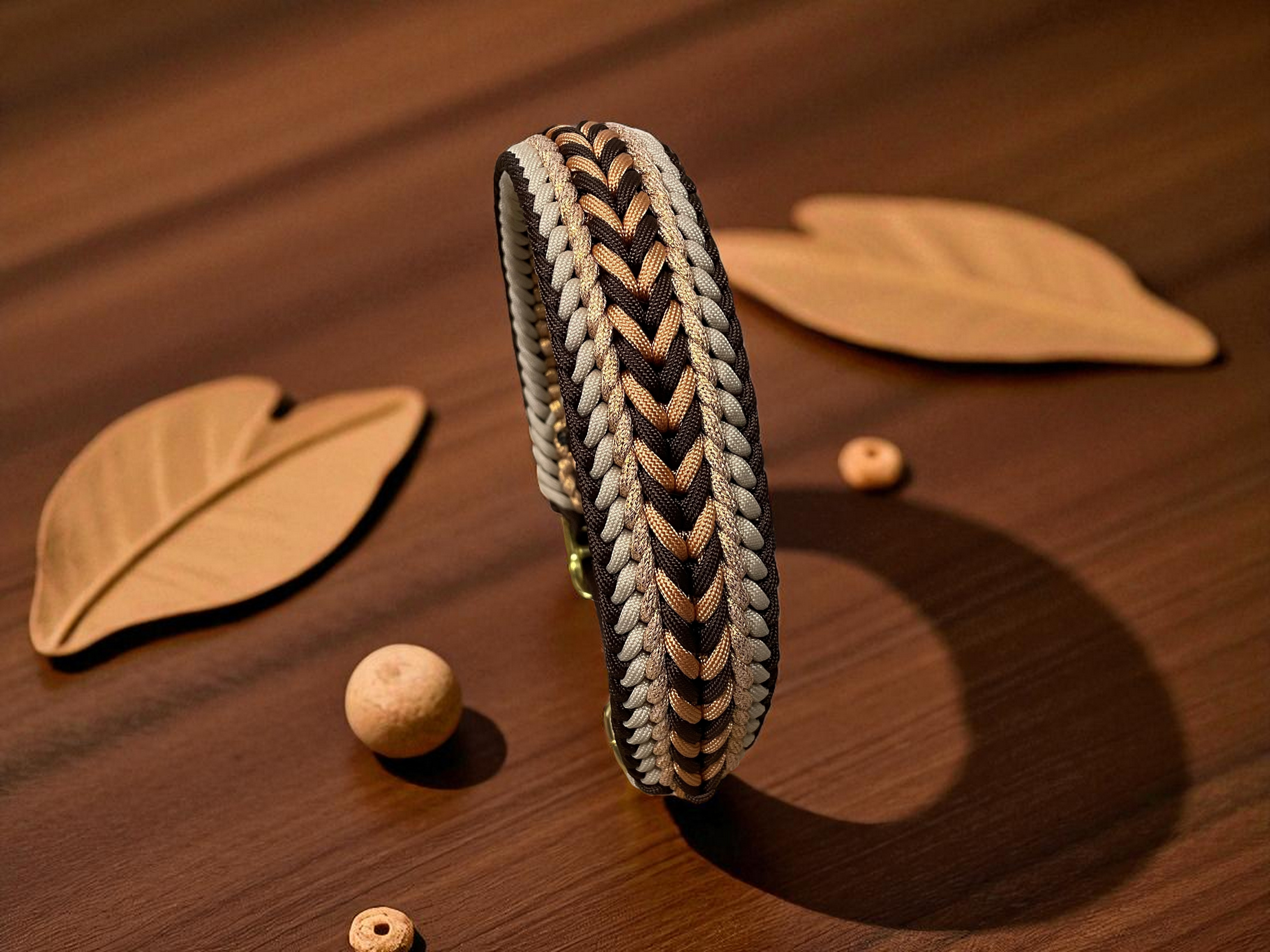 Das Halsband „Benno Mix“ wird aus Paracord gefertigt, ist ca. 4,5 cm breit und ca. 1 cm dick und verfügt über einen verstellbaren Biothane-Adapter in Braun.
