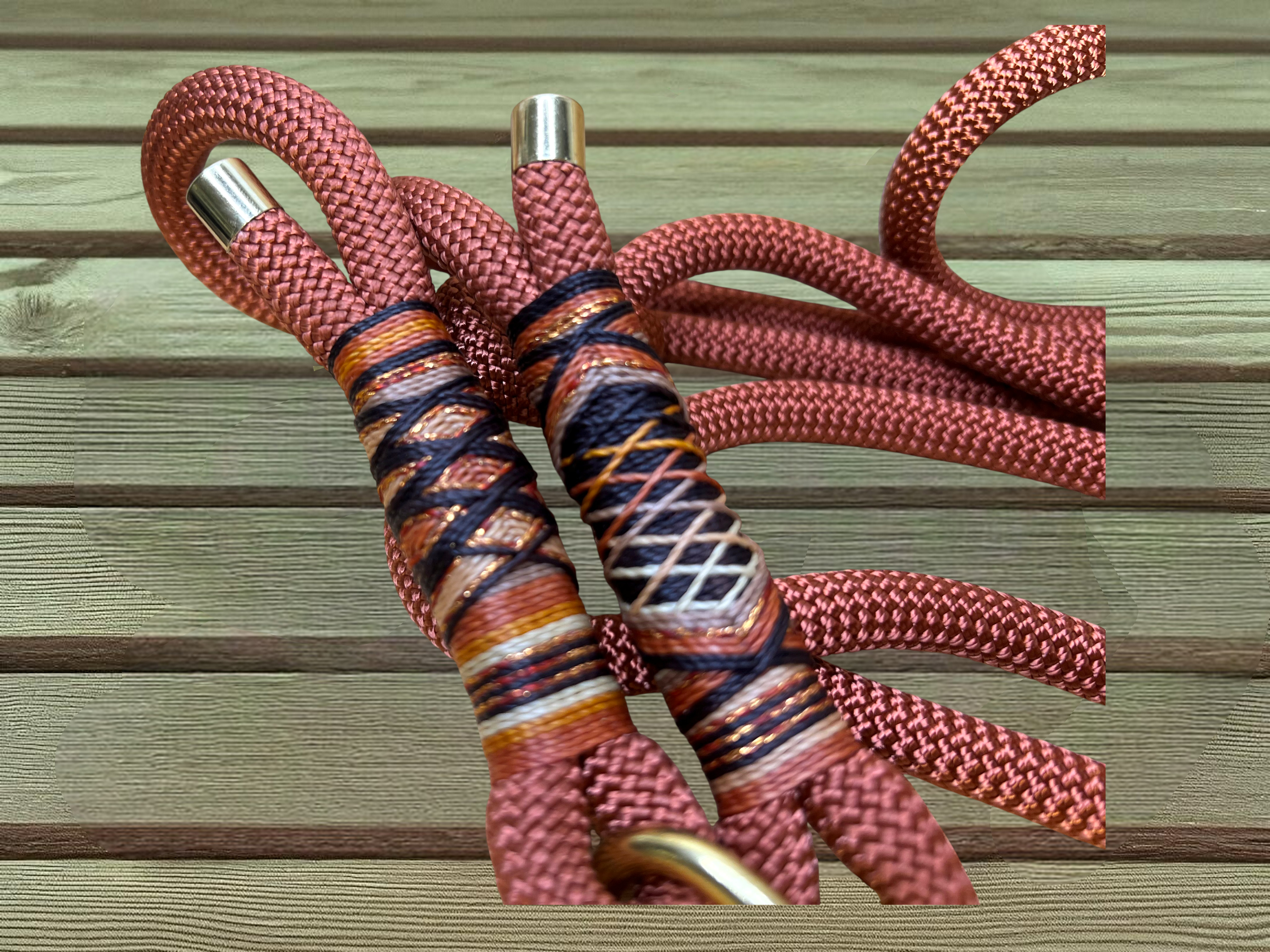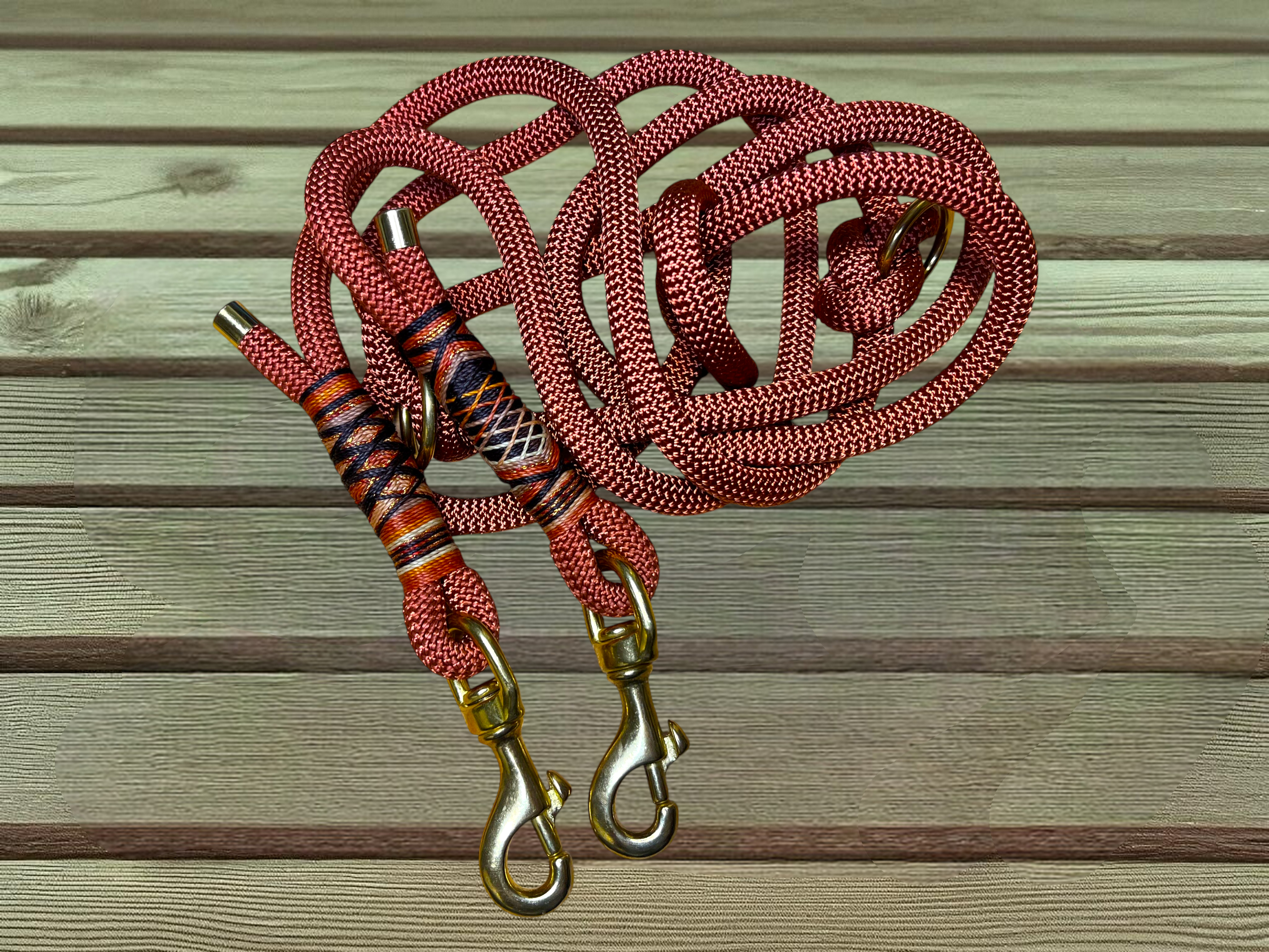 Die farblich abgestimmte Tauleine aus Premium-Nylonseil in Bronze-Braun ist ca. 2 m lang, 2-fach verstellbar und liegt angenehm in der Hand. Die exklusive Takelung in verschiedenen Braun- und Kupfertönen macht jede Leine zu einem individuellen Einzelstück.