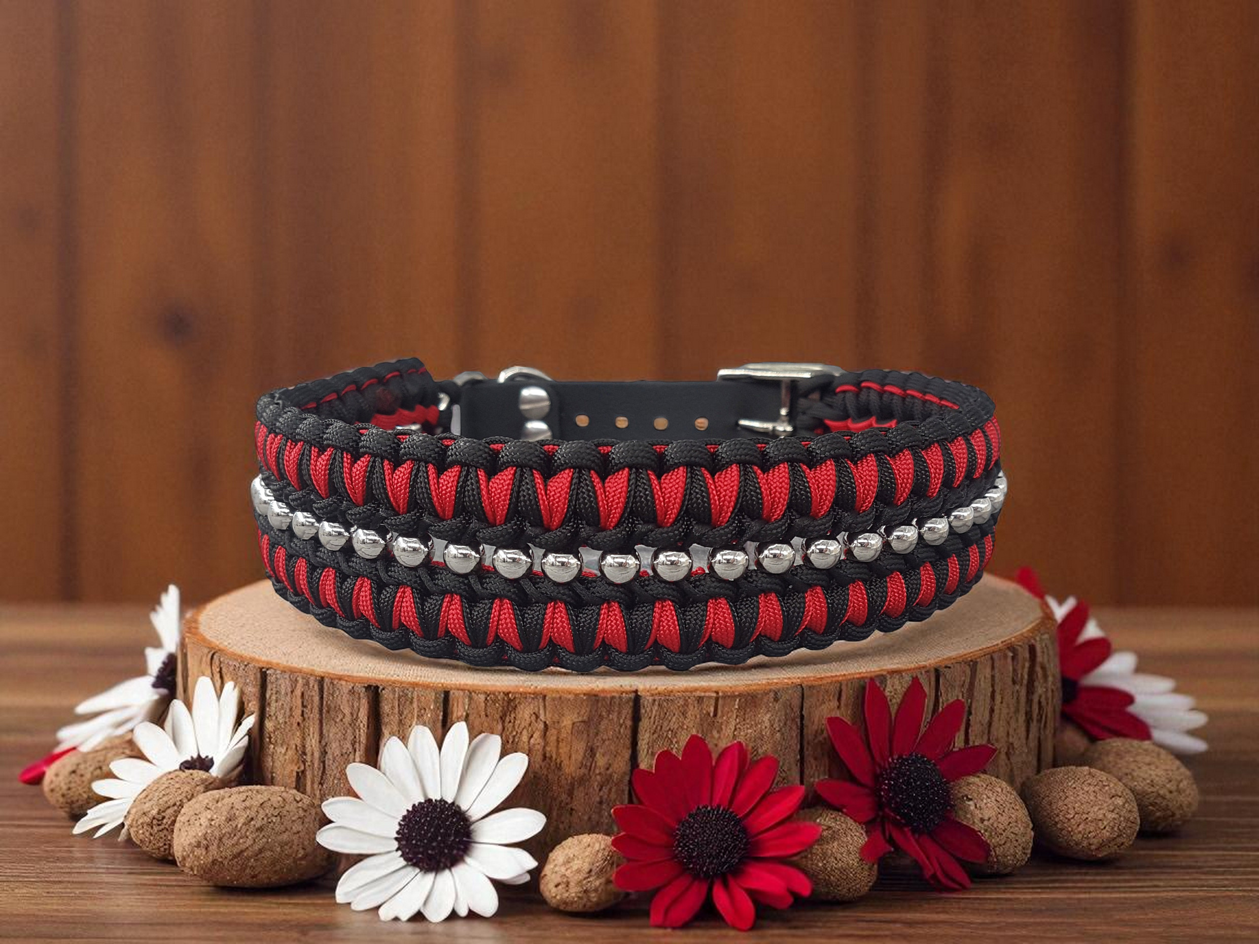 Die Farbkombination aus Schwarz und Rot sorgt für ein klares, kontrastreiches Gesamtbild. Der Biothane-Adapter ermöglicht eine flexible Anpassung an den Halsumfang Ihres Hundes und fügt sich farblich passend in das Design ein. Die Edelstahlbeschläge werden durch eingearbeitete Edelstahl-Perlen ergänzt, die dem Halsband einen dezenten dekorativen Akzent verleihen.