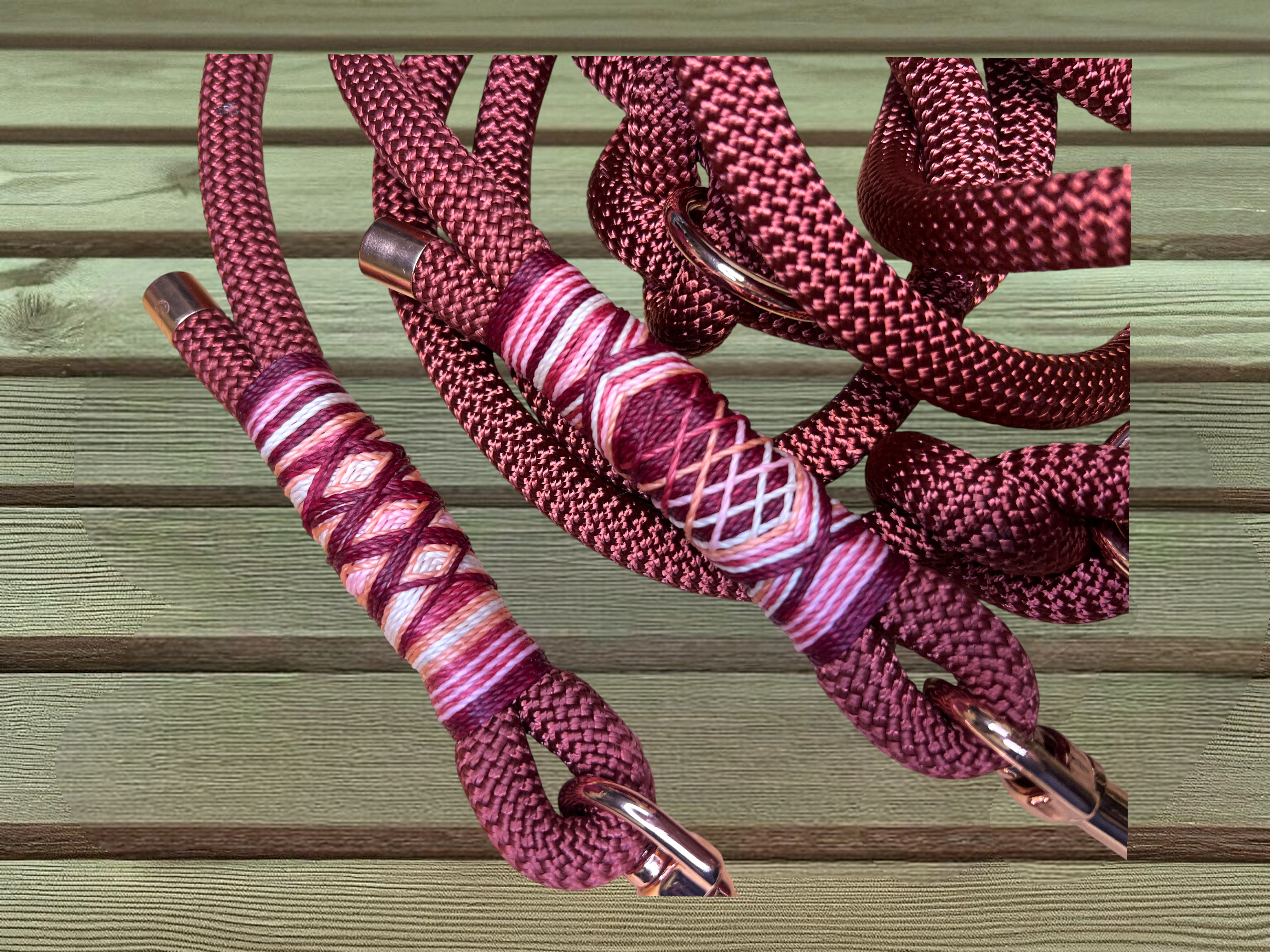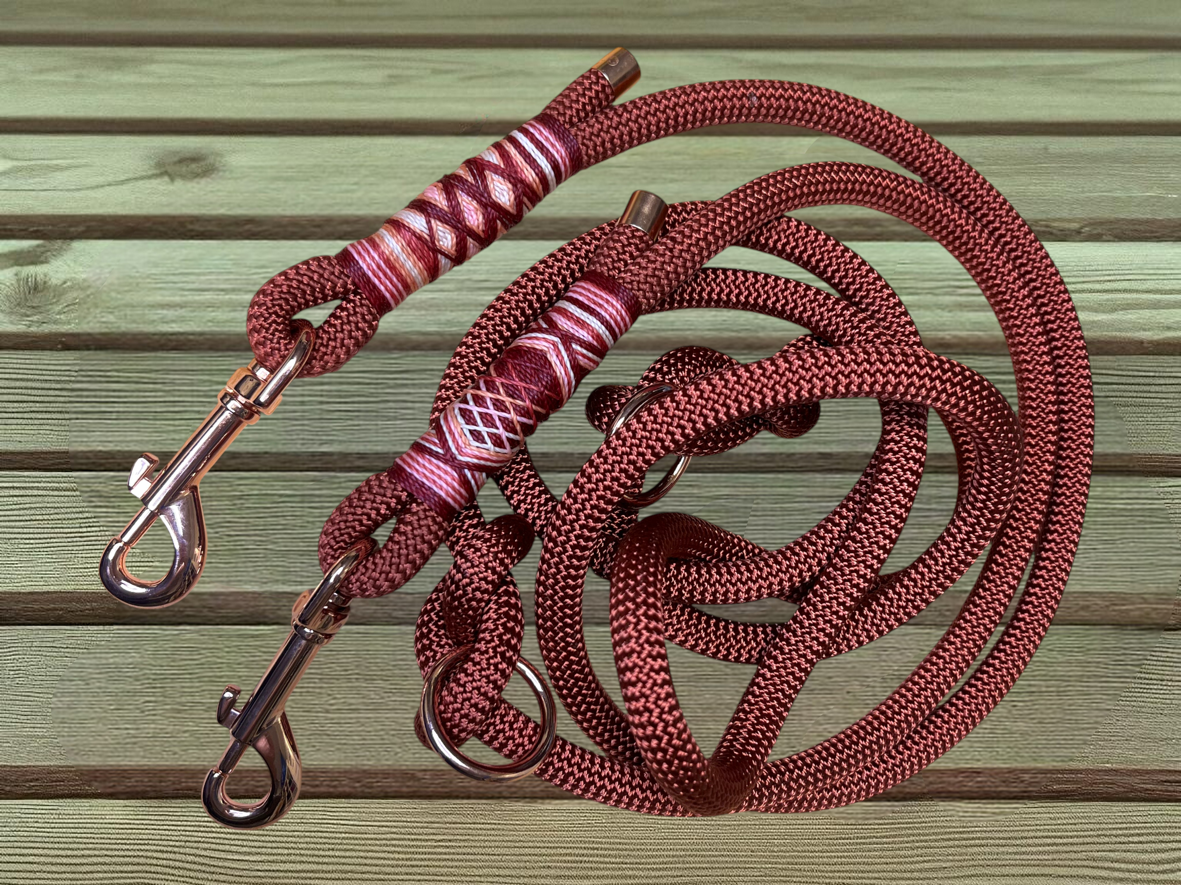 Die passende Tauleine „Copper Red“ besteht aus einem 10 mm starken Premium-Nylonseil, ist ca. 2 m lang und 2-fach verstellbar. Die aufwendige Takelung in Rosa-, Rot-, Weiß- und lachsfarbenen Nuancen macht jede Leine zu einem echten Unikat. Auch hier greifen die roségoldenen Beschläge das elegante Farbkonzept perfekt auf.