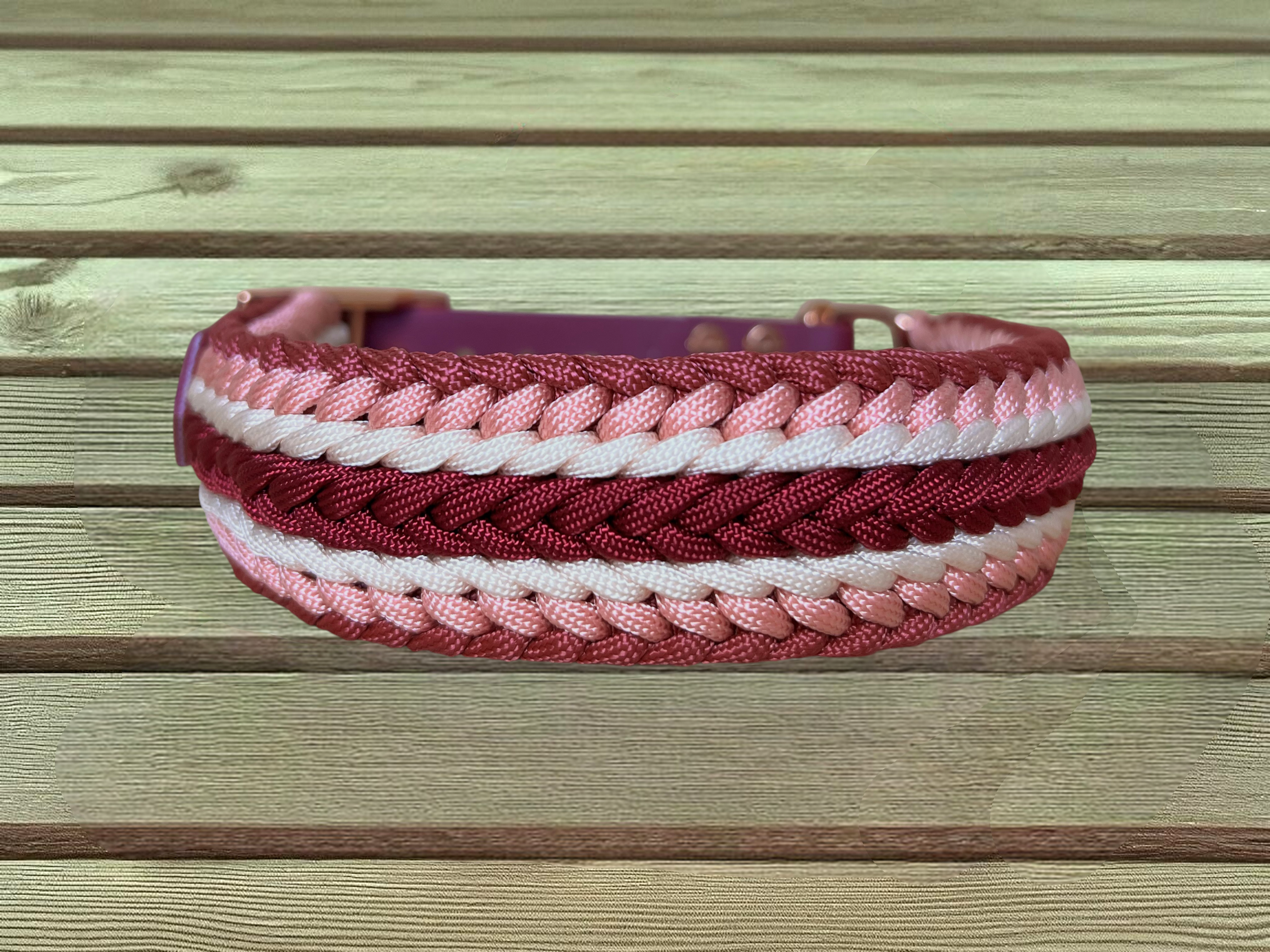 Das Paracord-Halsband "Waterkant" ist ca. 4,5 cm breit und ca. 1,2 cm dick und bietet dadurch eine stabile, angenehme Auflage am Hundehals. Die Farbkombination aus Crimson, Burgundy, Weiß und Pastell Peach wirkt elegant, warm und zeitlos. Ein verstellbarer Biothane-Adapter in Burgundy sorgt für eine perfekte Anpassung an den Halsumfang und ist zugleich pflegeleicht sowie formstabil. Die roségoldenen Beschläge setzen einen edlen Akzent und runden das Design stilvoll ab.
