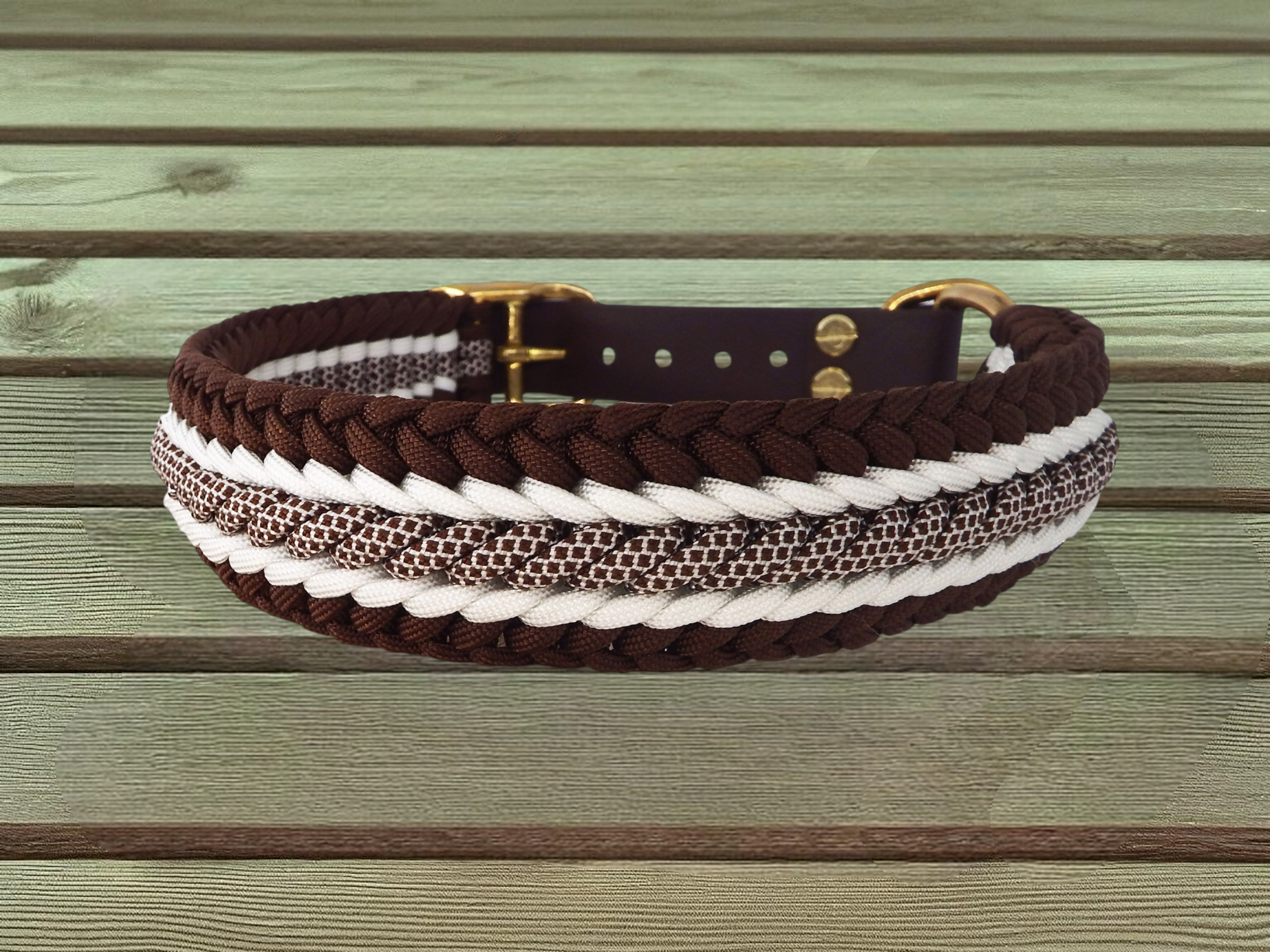 Die Farbkombination aus Walnut Braun und Weiß verleiht dem Halsband eine zeitlose, ruhige Optik. Das Walnut Braun / Weiß Diamond-Paracord setzt einen dezenten Akzent und lockert das Gesamtbild harmonisch auf. Die Messingbeschläge greifen die warmen Farbtöne auf und fügen sich stimmig in das Design ein. Der Biothane-Adapter ermöglicht eine flexible Anpassung an den Halsumfang Ihres Hundes und bleibt dabei formstabil sowie pflegeleicht.
