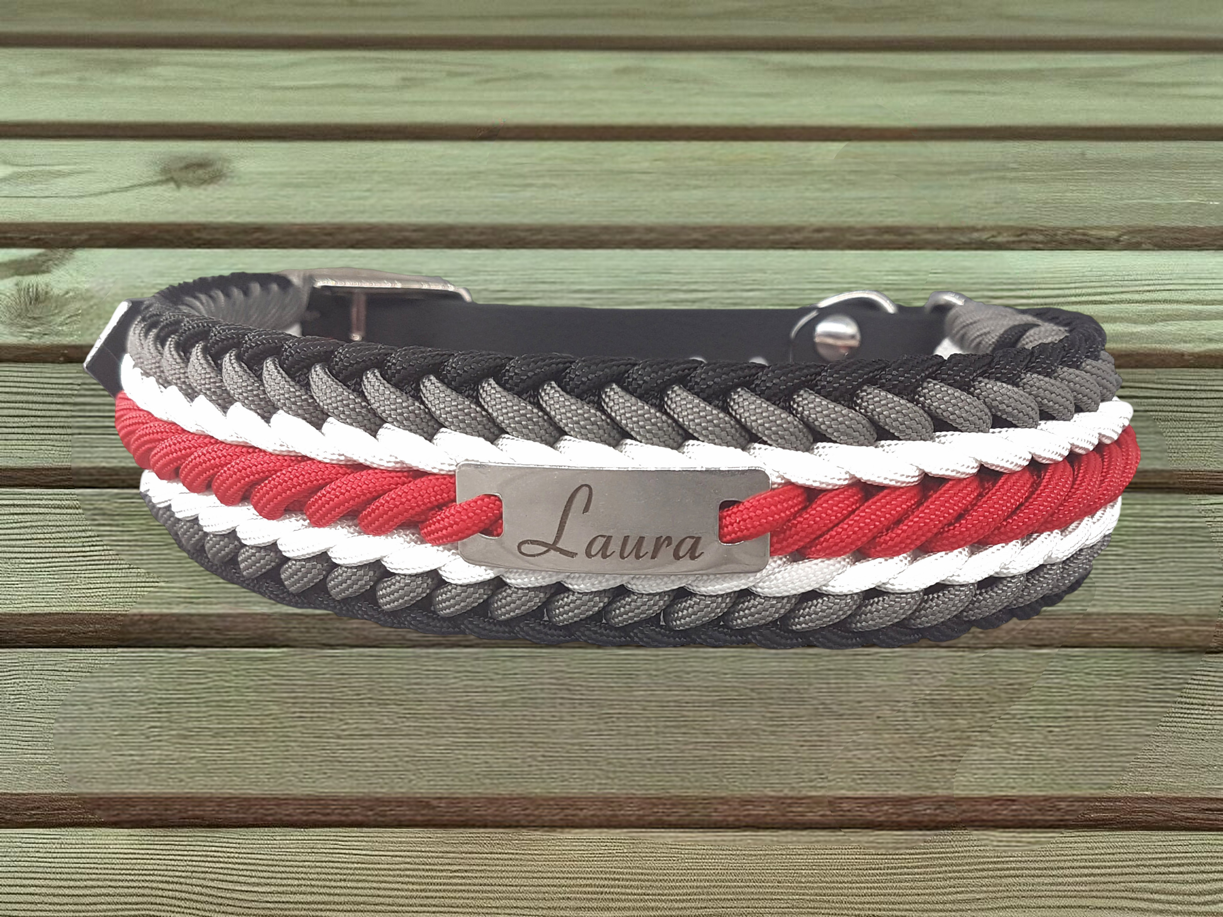Die Farbkombination aus Schwarz, Charcoal Grey, Weiß und Imperial Red sorgt für einen markanten, zeitlosen Look. Der kräftige Rotton setzt einen ausdrucksstarken Akzent und bildet einen klaren Kontrast zu den neutralen Grau-, Schwarz- und Weißtönen. Der verstellbare Biothane-Adapter in Schwarz ermöglicht eine flexible Anpassung an den Halsumfang Ihres Hundes und fügt sich dezent in das Design ein. Die Edelstahlbeschläge unterstreichen den modernen Charakter des Halsbands und eignen sich ideal für den täglichen Einsatz.