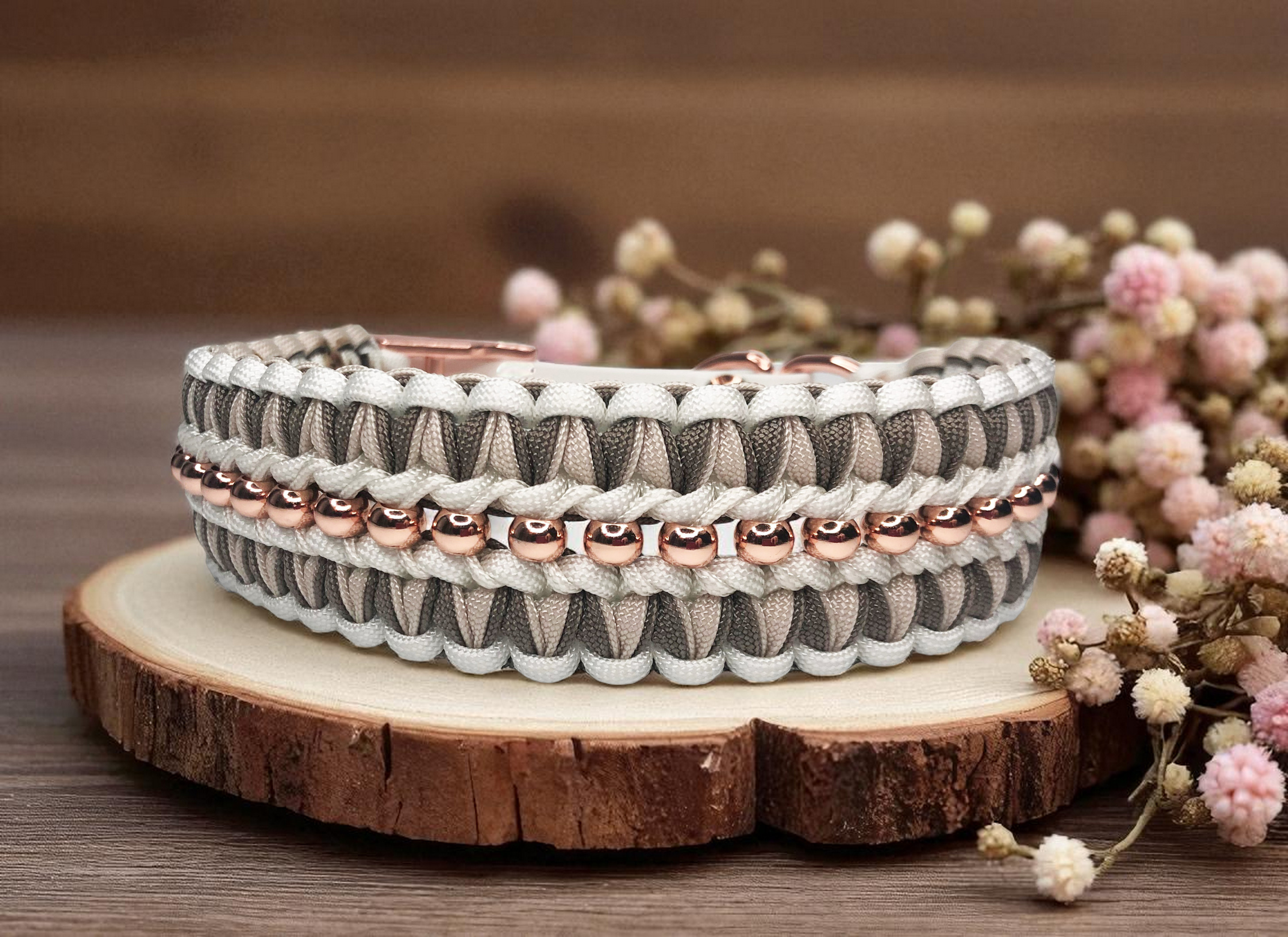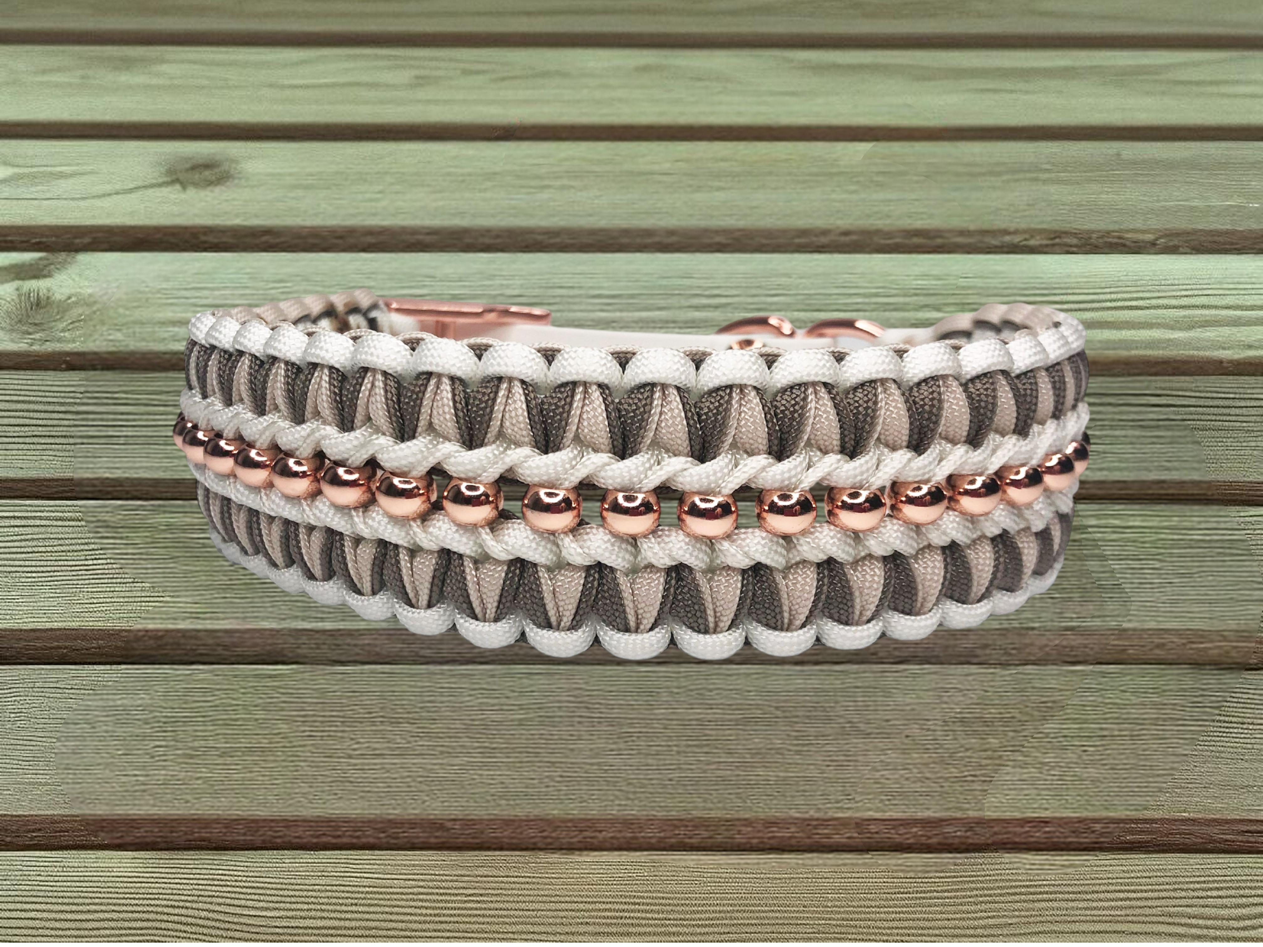 Das Paracord-Set Helmy – Ivory Grace vereint helle Naturtöne mit eleganten Roségold-Akzenten. Die Farbkombination aus Weiß, Browngold und Tan wirkt warm, harmonisch und zeitlos – ideal für alle, die ein edles, zurückhaltendes Design schätzen.