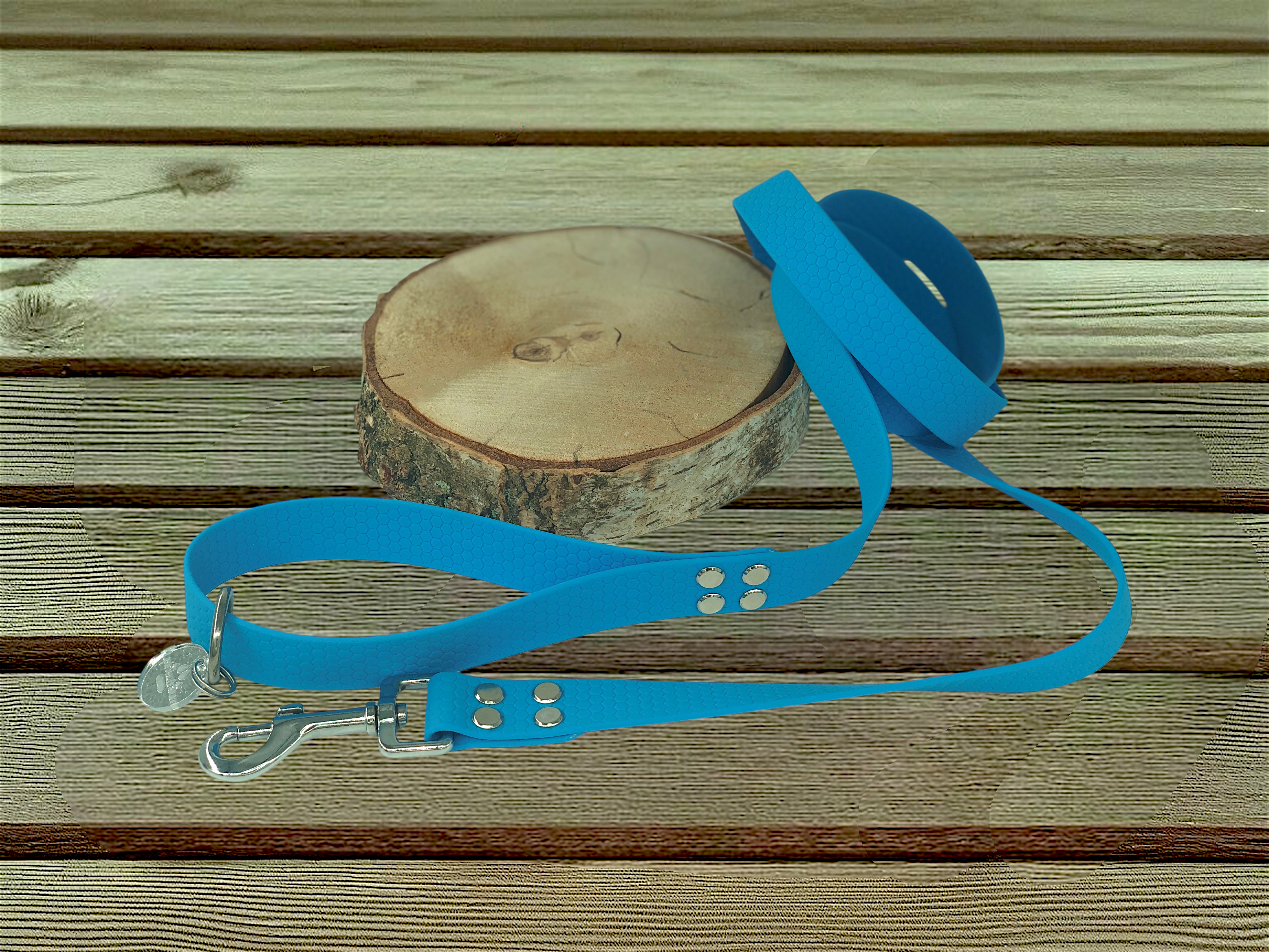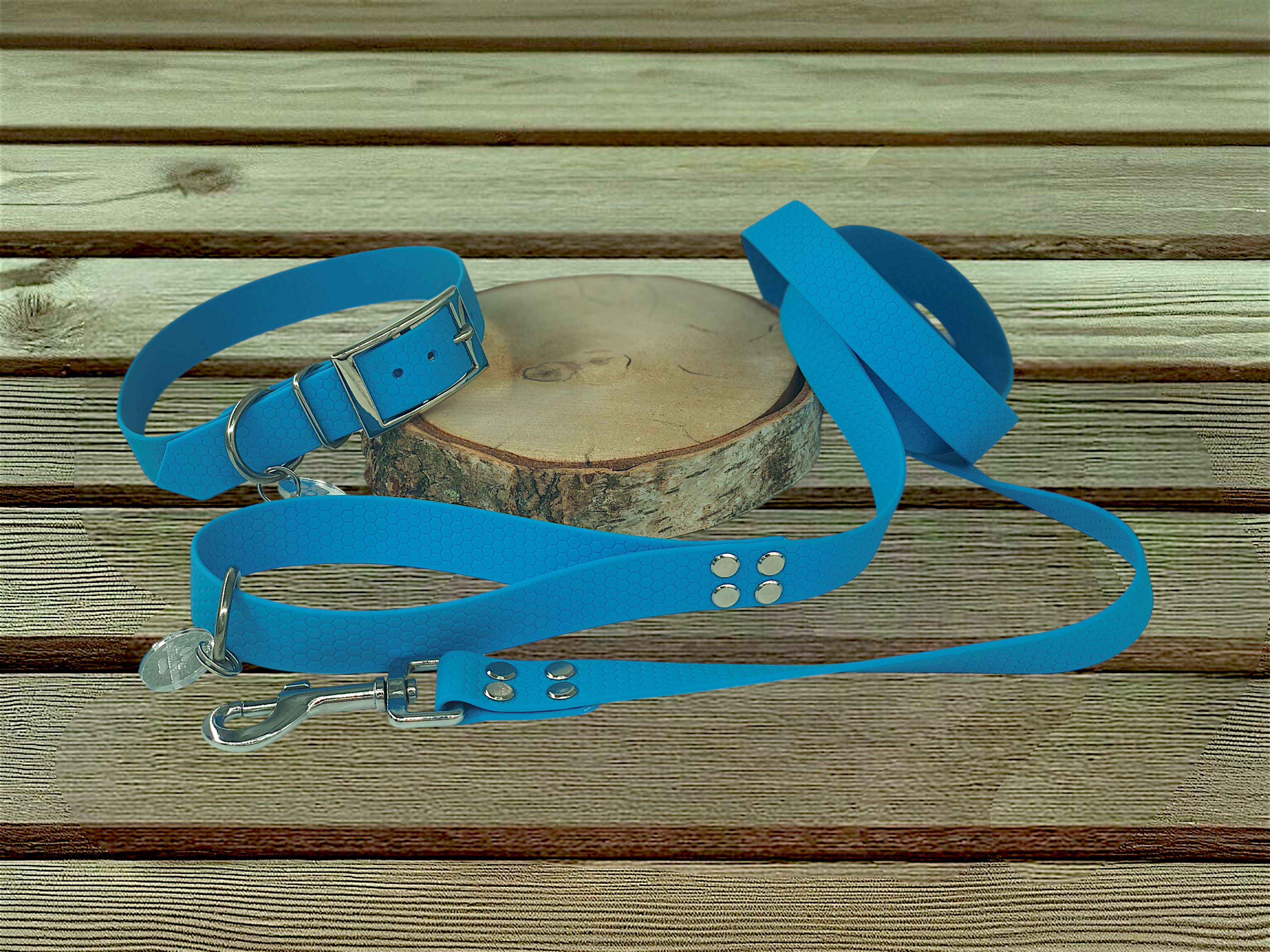 Die passende Leine ist ebenfalls aus Hexa-Gurtband gefertigt, 2,5 cm breit und ca. 1,5 m lang. Sie ist mit einer praktischen Handschlaufe ausgestattet und eignet sich ideal für Alltag, Training und kurze Wege. Dank der Materialeigenschaften ist das Set wetterfest, pflegeleicht und hygienisch.