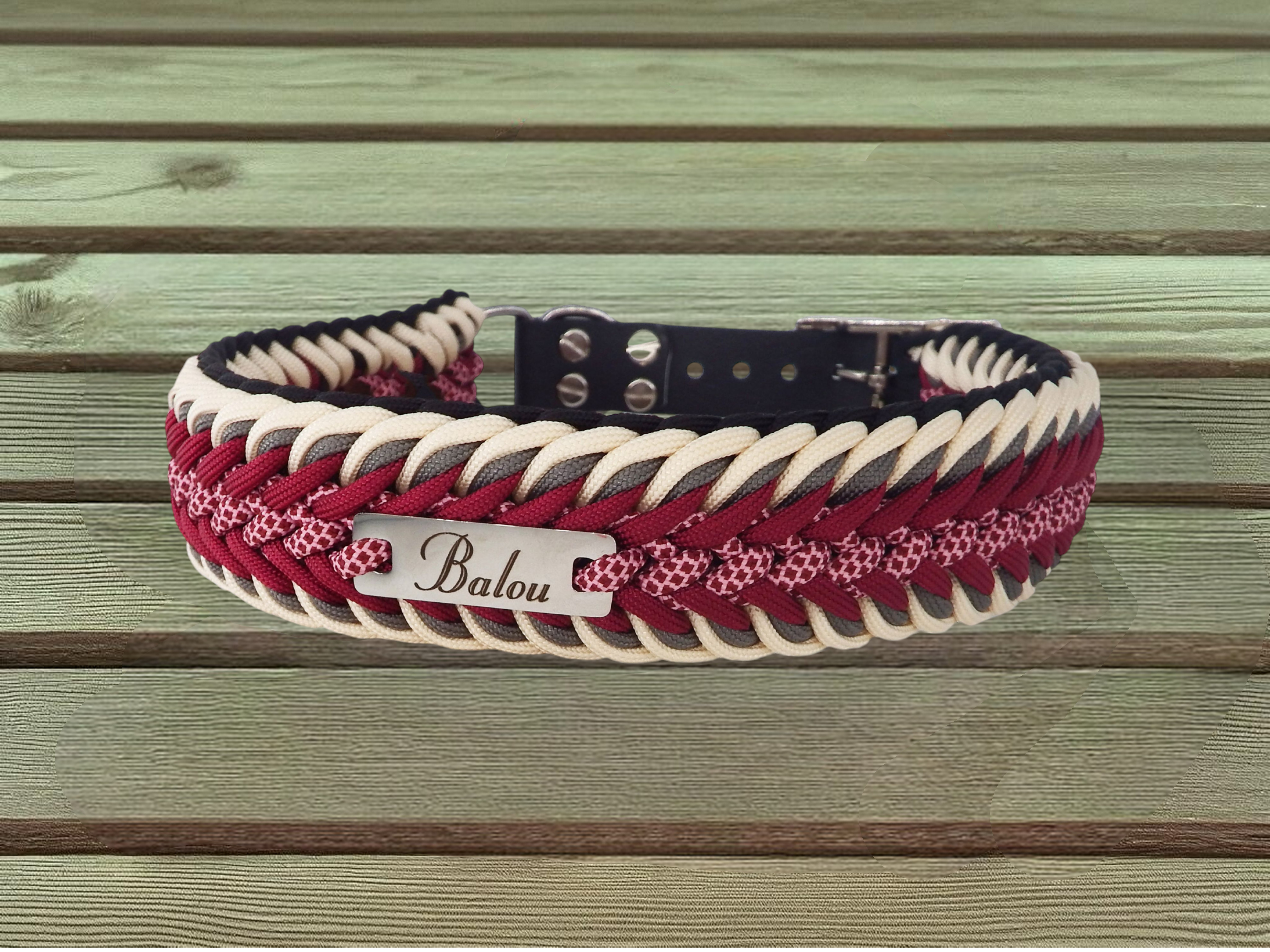 Die edle Farbkombination aus Creme, Burgundy, Charcoal Grey sowie Burgundy / Rosepink Diamond verleiht dem Set eine zeitlose, zugleich ausdrucksstarke Optik. Ein schwarzer Biothane-Adapter sorgt für Formstabilität, Pflegeleichtigkeit und Alltagstauglichkeit. Edelstahlbeschläge an Halsband und Leine runden das Design ab und stehen für Langlebigkeit und Sicherheit.
